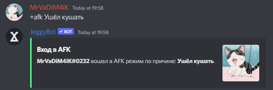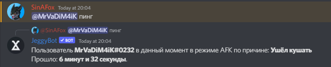 АФК режим — Это функция, с помощью которой бот будет отвечать на сообщения, где есть упоминания АФК участника с различной информацией.
