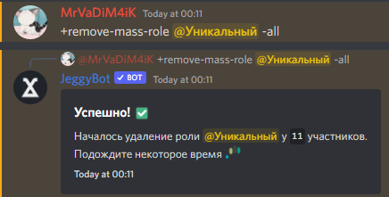Снятие ролей занимает некоторое время. Если снятие роли происходит у 1 000 и более участников, то этот процесс может занять длительное время, но в среднем 5-10 минут.