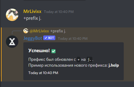 После этого действия бот не будет отвечать на старый префикс, а только на новый.