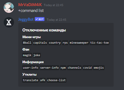 Для удобства был добавлен аргумент, позволяющий просмотреть все отключённые команды. Увидеть его можно написав команду ниже: