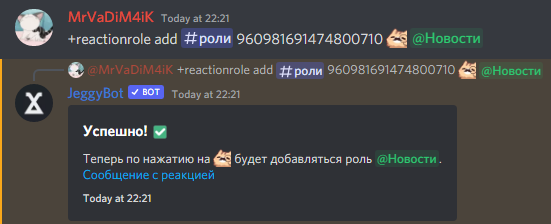 После добавления реакции бот начнёт реагировать на её нажатие и выдавать/забирать роль.
