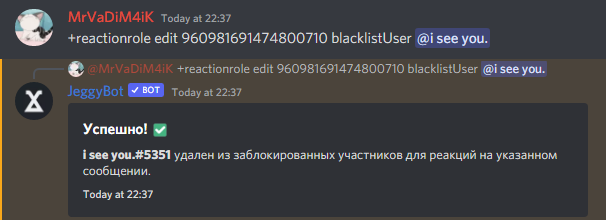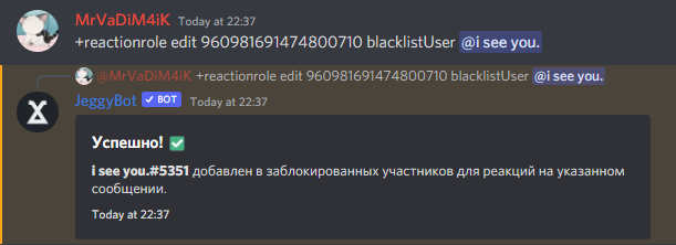 +reactionrole edit <ID сообщения> blacklistUser <Участник/ID>
