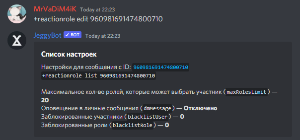 Если вы добавляете первую роль по реакции на указанное сообщение, то автоматически будут выставлены стандартные настройки. Посмотреть и изменить настройки можно командой ниже: